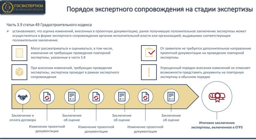 В случае если в ходе экспертного сопровождения в проектную документацию будут внесены изменения, требующие проведения экспертизы проектной документации, то орган исполнительной власти или организация, проводившая экспертизу, по итогам внесения таких изменений по заявлению застройщика или технического заказчика выдает заключение экспертизы проектной документации. Сведения о таком заключении подлежат включению в Единый государственный реестр заключений экспертизы проектной документации объектов капитального строительства (ЕГРЗ). В данном случае дополнительное направление проектной документации на проведение повторной экспертизы не требуется.